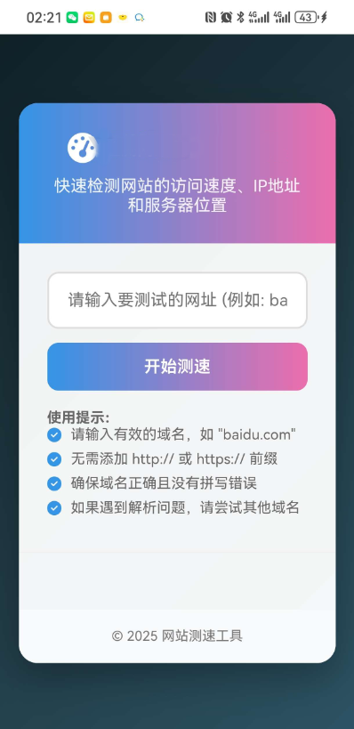 网站测速工具提供专业级的网络性能检测服务,帮助用户精准测量网站延迟、识别服务器IP及物理位置,并支持全设备适配。其智能诊断功能可提供问题解决方案,适用于网站管理员、SEO优化师、企业IT部门及普通用户。主要使用场景包括网站性能基准测试、定期监控、主机性能比较及地区性访问问题诊断。